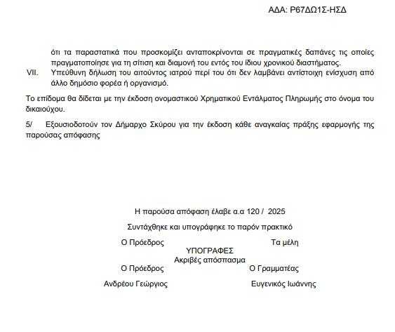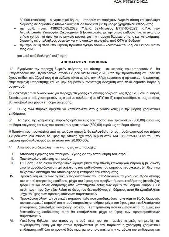 -Η απόφαση ελήφθη στο πλαίσιο των δυνατοτήτων που παρέχει η νομοθεσία στους νησιωτικούς Δήμους, και ειδικότερα: το άρθρο 32 του Ν. 4483/2017, όπως ισχύει, σε συνδυασμό με τη σχετική Κοινή Υπουργική Απόφαση (ΦΕΚ Β’ 3274/17-05-2023), που επιτρέπουν τη χορήγηση παροχών σίτισης και διαμονής, σε είδος ή σε χρήμα, σε ιατρικό προσωπικό που υπηρετεί σε νησιωτικές και απομακρυσμένες περιοχές.