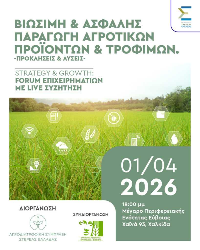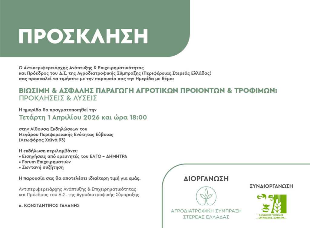 Περιφέρειας Στερεάς Ελλάδας κ Κωνσταντίνος Γαλάνης σας προσκαλεί να τιμήσετε με την παρουσία σας την Ημερίδα με θέμα: ΒΙΩΣΙΜΗ ΚΑΙ ΑΣΦΑΛΗΣ ΠΑΡΑΓΩΓΗ ΑΓΡΟΤΙΚΩΝ ΠΡΟΙΟΝΤΩΝ ΚΑΙ ΤΡΟΦΙΜΩΝ:ΠΡΟΚΛΗΣΕΙΣ ΚΑΙ ΛΥΣΕΙΣ η ημερίδα θα πραγματοποιηθεί την Τετάρτη 1 Απριλίου 2026 και ώρα18:00 στην Αίθουσα Εκδηλώσεων του Μεγάρου Περιφερειακής Ενότητας Εύβοιας(Λεωφόρος Χαϊνά 93) Η εκδήλωση περιλαμβάνει: