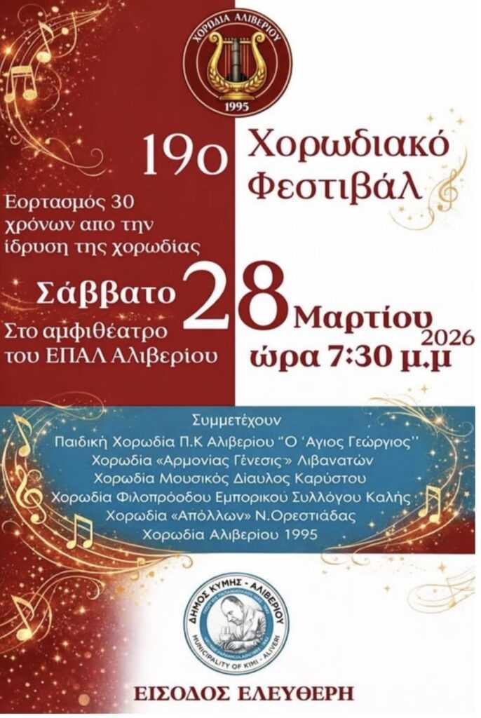 Το Αλιβέρι ετοιμάζεται να υποδεχθεί το 19ο Χορωδιακό Φεστιβάλ, το Σάββατο 28 Μαρτίου στις 19:30, στο αμφιθέατρο του ΕΠΑΛ Αλιβερίου, σε μια βραδιά αφιερωμένη στη μουσική και τη δύναμη της χορωδιακής έκφρασης. Η φετινή διοργάνωση έχει ιδιαίτερη σημασία, καθώς σηματοδοτεί τη συμπλήρωση 30 χρόνων δημιουργικής παρουσίας της Χορωδίας Αλιβερίου, η οποία όλα αυτά τα χρόνια αποτελεί σταθερό σημείο αναφοράς για τα πολιτιστικά δρώμενα της περιοχής. Στη σκηνή θα ανέβουν αξιόλογα χορωδιακά σύνολα, παρουσιάζοντας ένα πρόγραμμα υψηλού επιπέδου που αναμένεται να ταξιδέψει το κοινό μέσα από διαφορετικά μουσικά ακούσματα. Η εκδήλωση πραγματοποιείται με την υποστήριξη του Δήμου Κύμης – Αλιβερίου και η είσοδος είναι ελεύθερη για το κοινό.