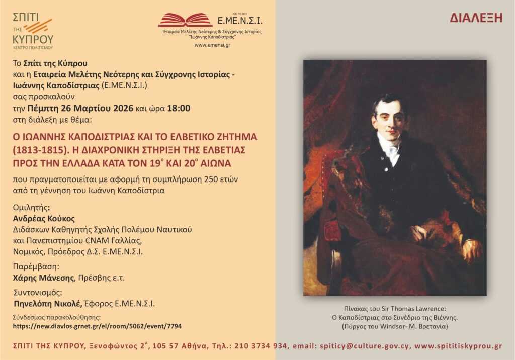 Σας ενημερώνουμε και πάλι, ότι η εκδήλωση για το ελβετικό ζήτημα και την προσφορά του Ιωάννη Καποδίστρια θα πραγματοποιηθεί σήμερα στις 18:00 στο Σπίτι της Κύπρου. Θα μιλήσουν ο κ. Ανδρέας Κούκος και ο Πρέσβης ε.τ. κ. Χαράλαμπος Μάνεσης.Η εκδήλωση είναι η πρώτη μίας σειράς εκδηλώσεων με αφορμή τα 250 χρόνια από την γέννησητου Ιωάννη Καποδίστρια!