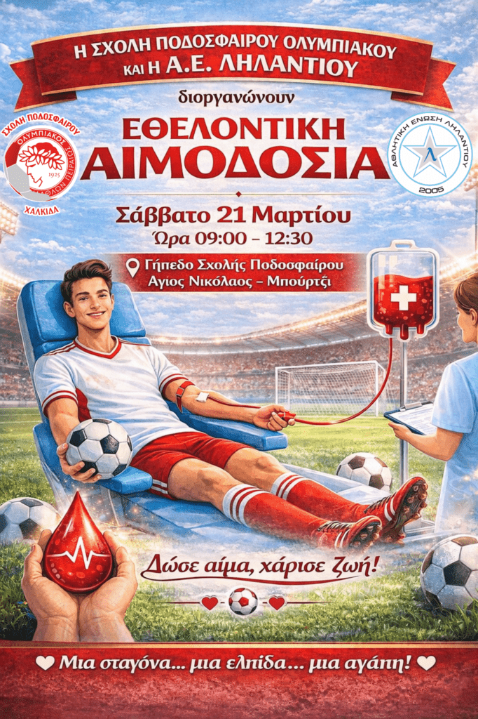 Η Σχολή Ποδοσφαίρου Ολυμπιακού σε συνεργασία με την Αθλητική Ένωση Ληλαντίου διοργανώνουν Εθελοντική Αιμοδοσία, το Σάββατο 21 /03  στις εγκαταστάσεις της σχολής, από ώρα 09:00 έως 12:30.