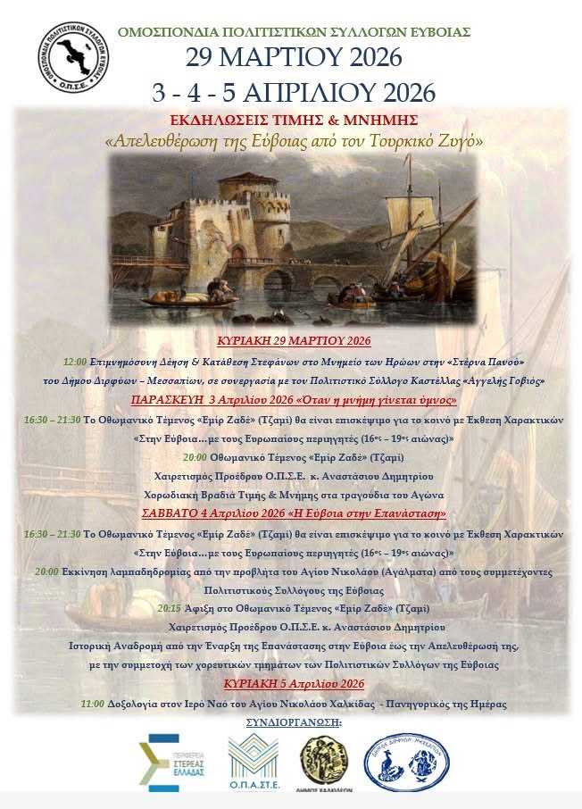 Με επίκεντρο τη μνήμη, την ιστορική συνείδηση και την τιμή στους αγώνες του τόπου, η Ομοσπονδία Πολιτιστικών Συλλόγων Εύβοιας διοργανώνει σειρά εκδηλώσεων με τίτλο «Απελευθέρωση της Εύβοιας από τον Τουρκικό Ζυγό», από τις 29 Μαρτίου έως και τις 5 Απριλίου 2026.