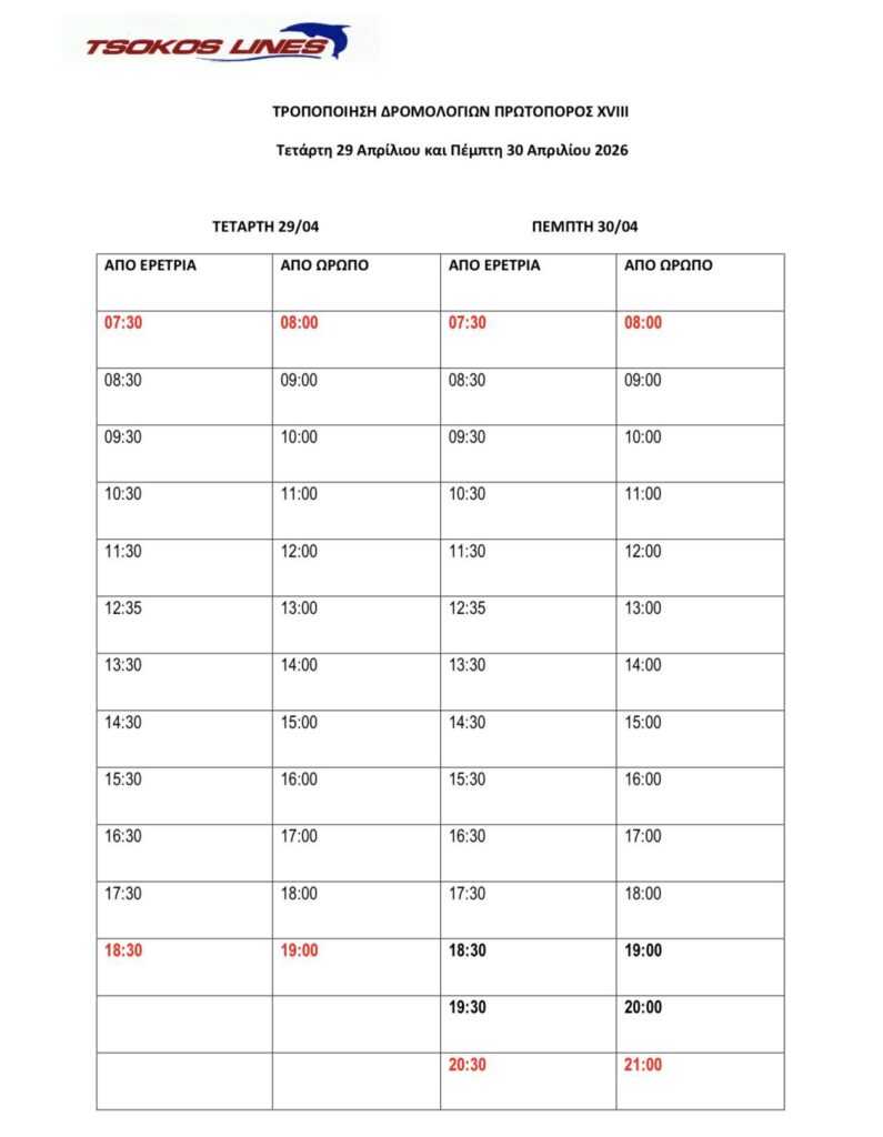 Σύμφωνα με την ενημέρωση, τα δρομολόγια στη γραμμή Ερέτρια – Ωρωπός θα πραγματοποιηθούν με αλλαγές στις ώρες αναχώρησης, όπως αποτυπώνονται στον σχετικό πίνακα.