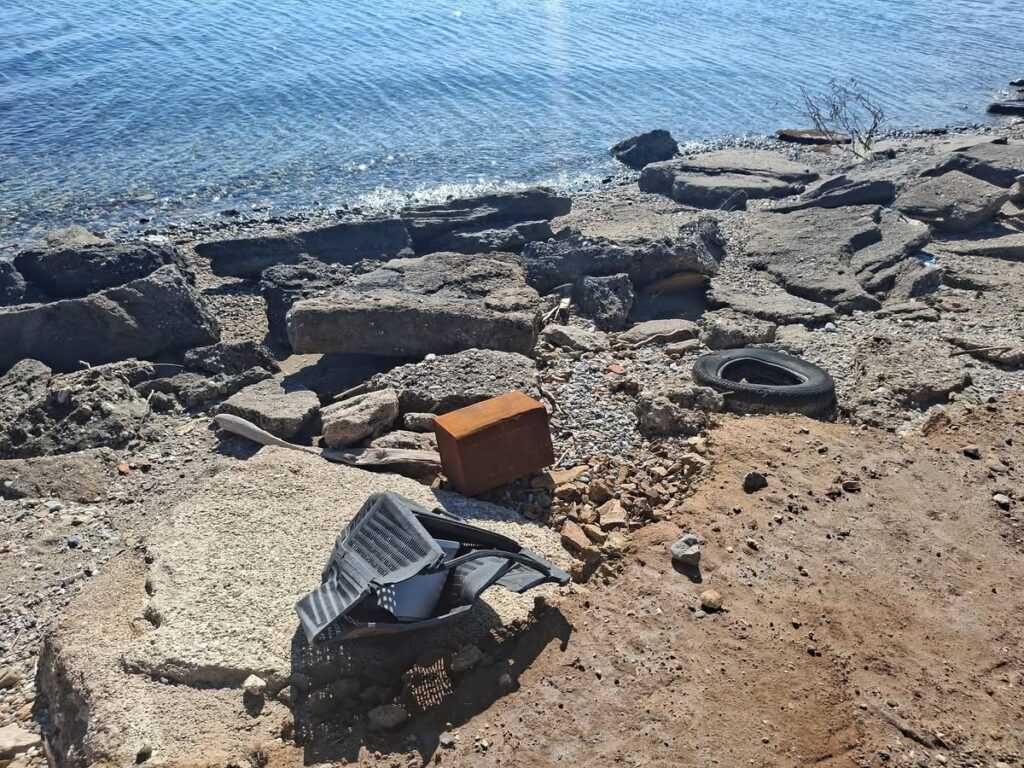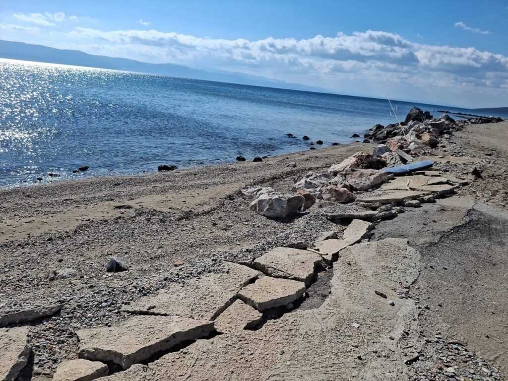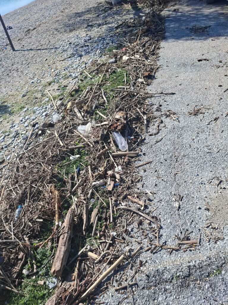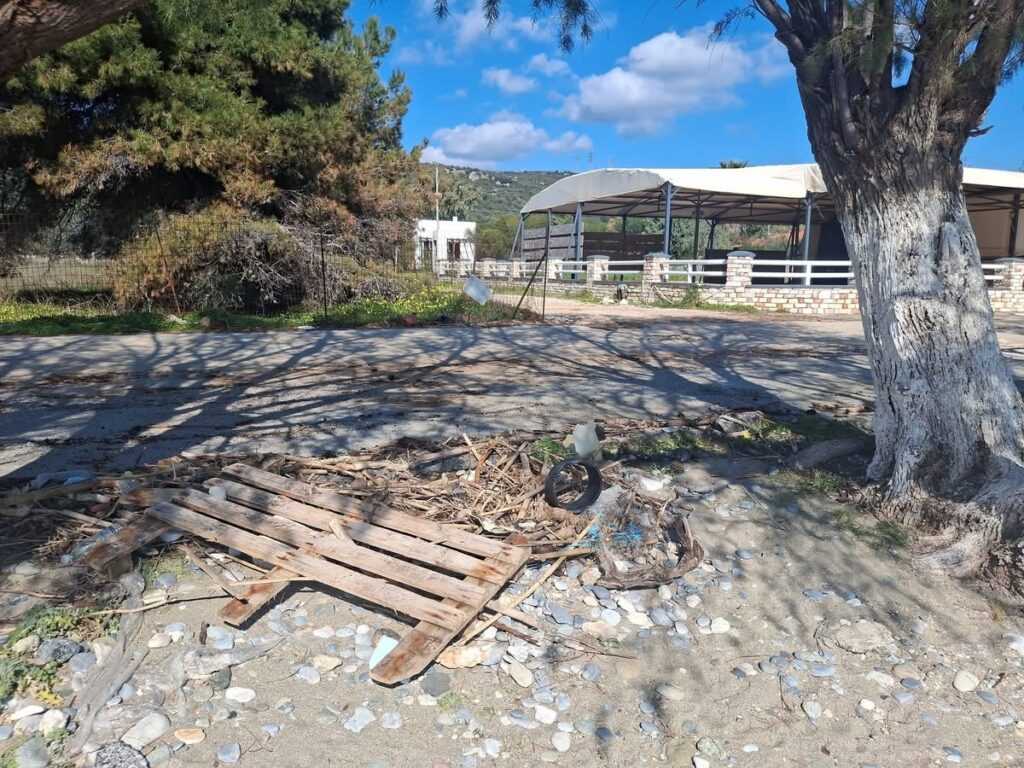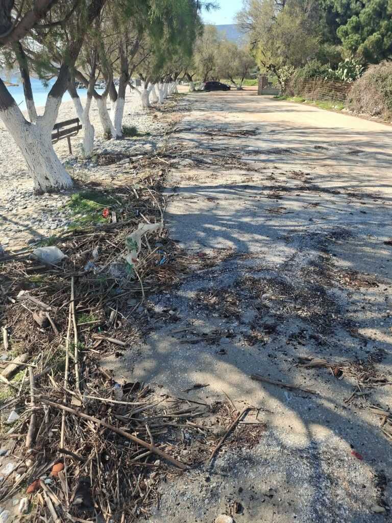 Σύμφωνα με όσα καταγγέλλονται, φερτά υλικά όπως ξύλα, σκουπίδια και άμμος εξακολουθούν να καλύπτουν δρόμους και παραλίες, ενώ η διάβρωση των ακτών είναι εμφανής. Την ίδια στιγμή, υποδομές παραμένουν κατεστραμμένες, με παγκάκια, ομπρέλες και αλλαξιέρες να έχουν αφεθεί στην τύχη τους, χωρίς καμία μέριμνα αποκατάστασης ή αποθήκευσης κατά τη χειμερινή περίοδο.