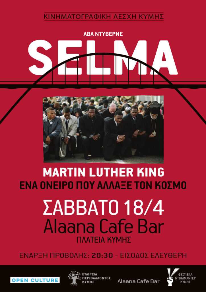 Μια ταινία για τον Μάρτιν Λούθερ Κινγκ και τον μεγάλο αγώνα για ψήφο στους μαύρους πολίτες. Θα προβληθεί στο alaana cafe bar πλατεία Κύμης το Σάββατο 18 Απρίλιου ωρα 20:30.