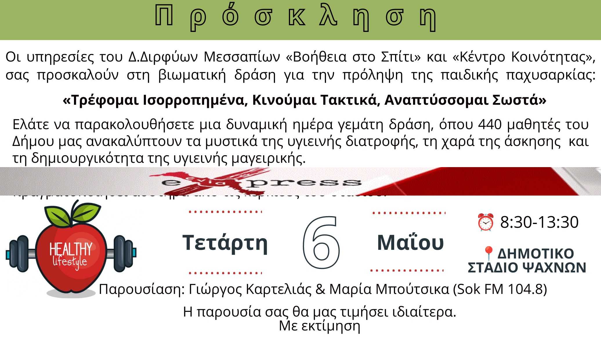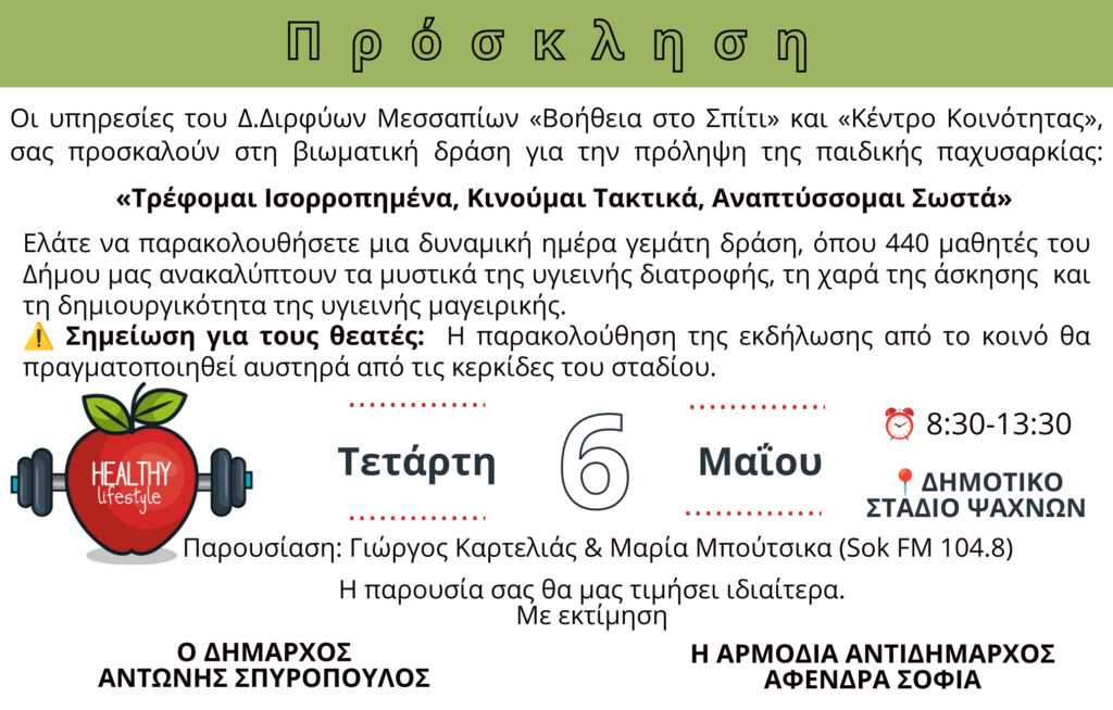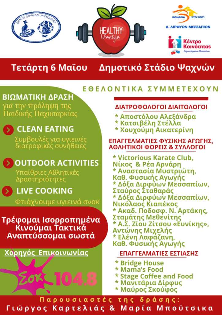 Στο πλαίσιο των προγραμμάτων Πρόληψης και Προαγωγής Υγείας, οι υπηρεσίες «Βοήθεια στο Σπίτι» και «Κέντρο Κοινότητας» του Δήμου Διρφύων-Μεσσαπίων, σε συνεργασία με την Επιμελήτρια Α’ Γενικής Ιατρικής του Π.Ι. Στροπώνων – Κ.Υ.Ψαχνών και την Αρμόδια Αντιδήμαρχο Υγείας, κ. Αφένδρα Σοφία, διοργανώνουν μια μεγάλη βιωματική δράση για την πρόληψη της παιδικής παχυσαρκίας, «Τρέφομαι Ισορροπημένα, Κινούμαι Τακτικά, Αναπτύσσομαι Σωστά».