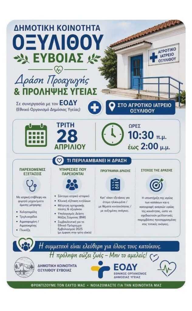 Με ιδιαίτερα μεγάλη συμμετοχή και έντονο ενδιαφέρον από τους κατοίκους ολοκληρώθηκε η δράση προληπτικής υγείας του ΕΟΔΥ, που πραγματοποιήθηκε στο Αγροτικό Ιατρείο Οξυλίθου.