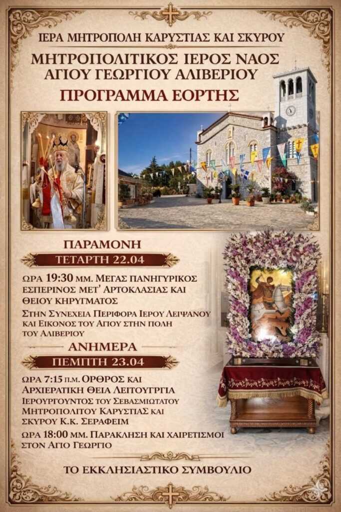 Οι εκδηλώσεις ξεκινούν την παραμονή της εορτής, την Τετάρτη 22 Απριλίου, στις 19:30, με τον Μέγα Πανηγυρικό Εσπερινό μετ’ αρτοκλασίας και θείου κηρύγματος. Στη συνέχεια θα πραγματοποιηθεί η περιφορά του Ιερού Λειψάνου και της Εικόνας του Αγίου Γεωργίου στους δρόμους του Αλιβερίου, σε μια στιγμή ιδιαίτερης πνευματικής σημασίας για την τοπική κοινωνία.
