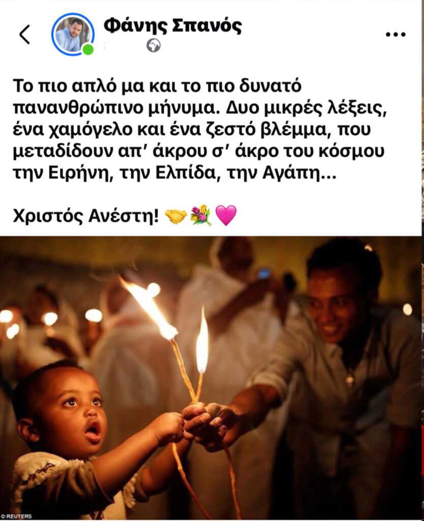 Λιτό αλλά ουσιαστικό το μήνυμα για την Ανάσταση και το Πάσχα που επέλεξε να απευθυνθεί στους πολίτες ο Περιφερειάρχης Στερεάς Ελλάδας, κ. Φάνης Σπανός, μένοντας μακριά από τις μεγάλες διατυπώσεις, συνοδεύοντάς το με μια εικόνα που αποτυπώνει με τον πιο άμεσο τρόπο το βαθύτερο νόημα των ημερών.