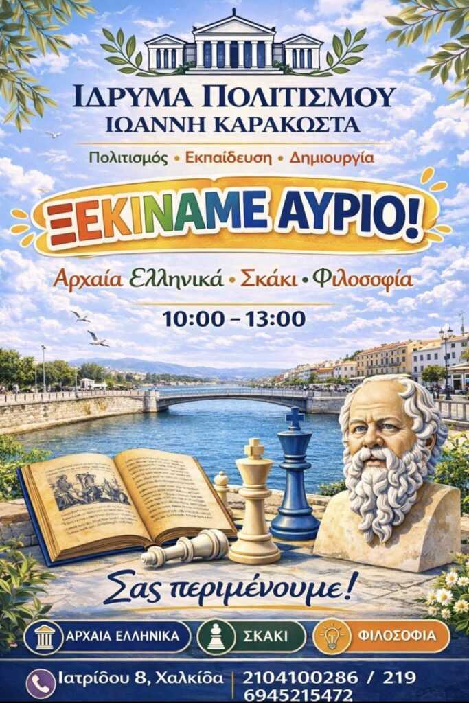 Ξεκινάει αυτό το Σάββατο 18 Απριλίου, στη Χαλκίδα, από το Ίδρυμα Πολιτισμού Ιωάννη Καράκωστα ένα ξεχωριστό 3ωρο πρόγραμμα γνώσης και δημιουργίας για παιδιά.