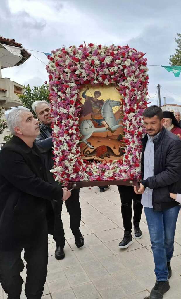 Την εικόνα του Αγίου Γεωργίου, όπως κάθε χρόνο, μετέφεραν άνδρες της Πυροσβεστικής Υπηρεσίας, τιμώντας με τον δικό τους τρόπο τον προστάτη Άγιο, υπό τη συνοδεία φιλαρμονικής μπάντας που προσέφερε ο Δήμος Κύμης Αλιβερίου, παιδιών και γυναικών από τα χορευτικά τμήματα του Πνευματικού Κέντρου ο «Άγιος Γεώργιος», ντυμένες με παραδοσιακές φορεσιές, δίνοντας έτσι ένα ξεχωριστό τόνο συμμετοχής και τοπικής παράδοσης στην πανηγυρική εκδήλωση, και βέβαια πλήθος πιστών που ακολούθησαν τη λιτανεία.