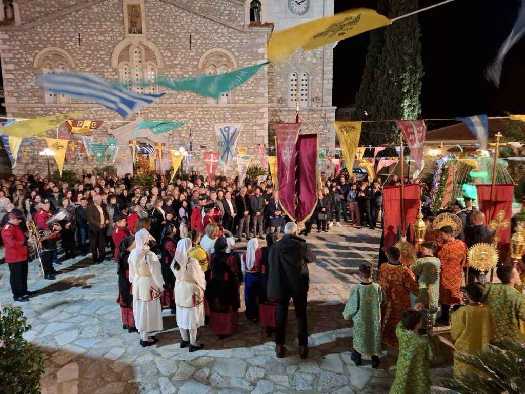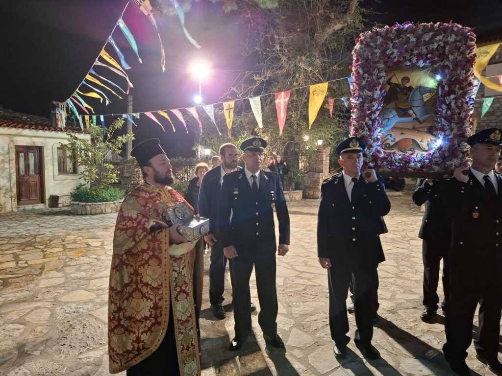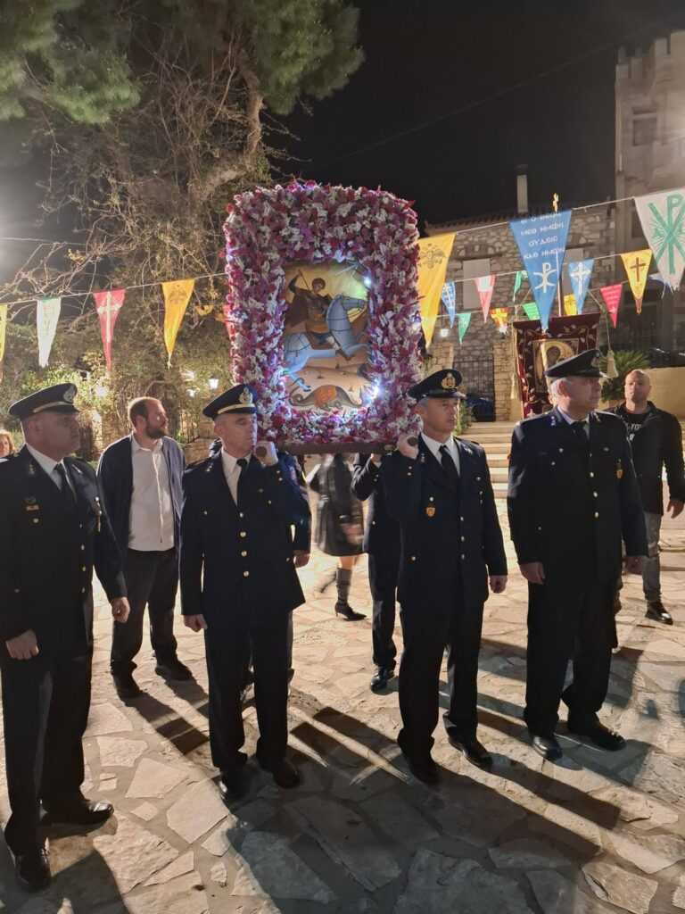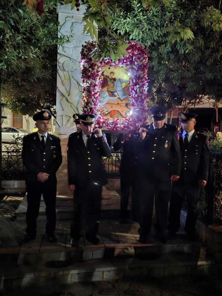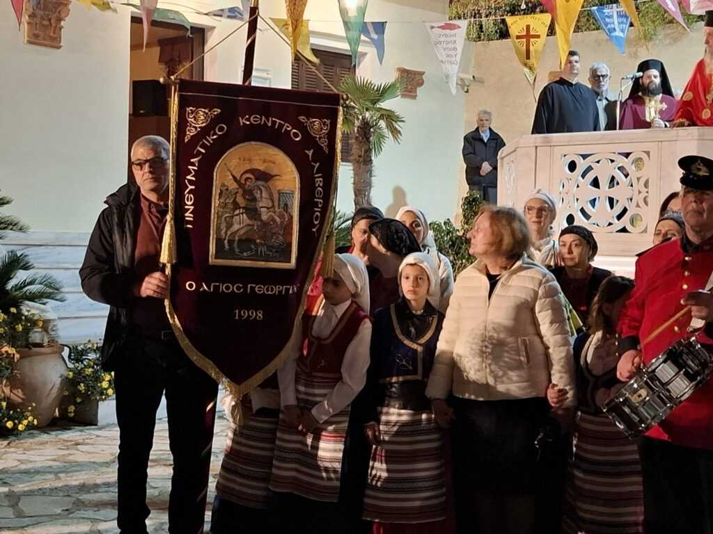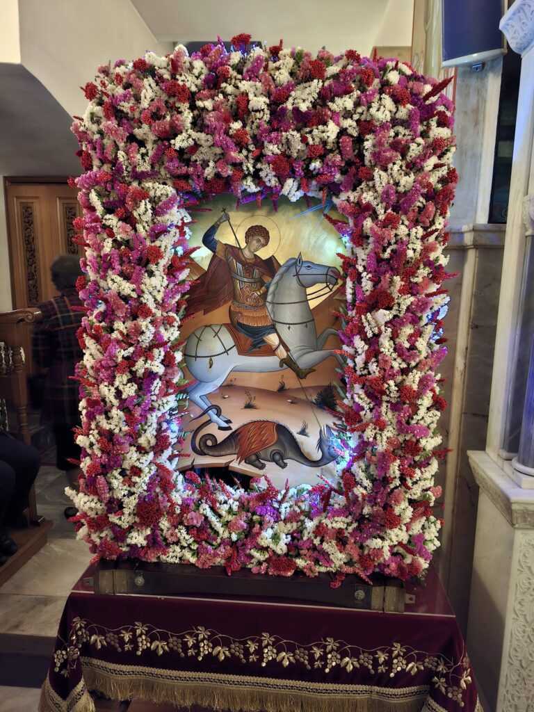 Με τη δέουσα κατάνυξη εορτάστηκε η μνήμη του Αγίου και ενδόξου Μεγαλομάρτυρος Γεωργίου την παραμονή της εορτής, όπου τελέστηκε το απόγευμα ο Μέγας Πανηγυρικός Εσπερινός, παρουσία πλήθους πιστών που κατέκλυσαν τον ιερό ναό, προεξάρχοντος του πανοσιολογιωτάτου αρχιμανδρίτου π. Ειρηναίου, ηγουμένου της Ιεράς Μονής Νέου Στουδίου Αυλώνος. Συλλειτούργησαν οι πατέρες Δωσίθεος από την ίδια Μονή, Αμφιλόχιος από τον Ιερό Ναό Αγίας Μαρίνας Αλιβερίου, π. Νεκτάριος, π. Κυριάκος από την ενορία Αμάρυνθου, π. Γεώργιος από την ενορία Καράβου, π.Γεώργιος από την ενορία Αγίου Λουκά, π. Ευάγγελος από την ενορία Αγίου Ιωάννη και π. Απόστολος από την ενορία Βέλους, καθώς και ο εφημέριος του ιερού ναού π. Νικόδημος.